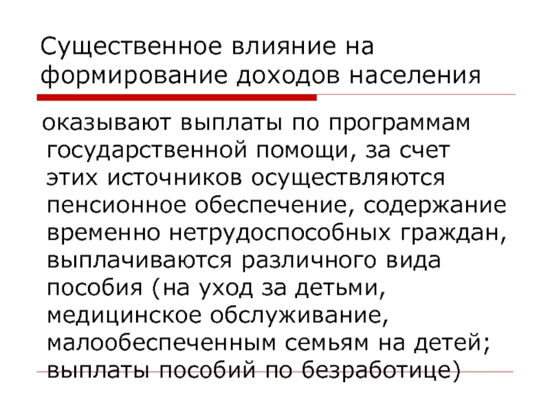 программам государственной помощи, за счет этих источников осуществляются пенсионное обеспечение, содержание временно нетрудоспособных граждан, выплачиваются различного вида пособия (на уход за детьми, медицинское обслуживание, малообеспеченным семьям на детей; выплаты пособий по безработице)