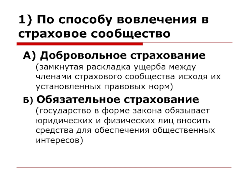 Б) Обязательное страхование (государство в форме закона обязывает юридических и физических лиц вносить средства для обеспечения общественных интересов)