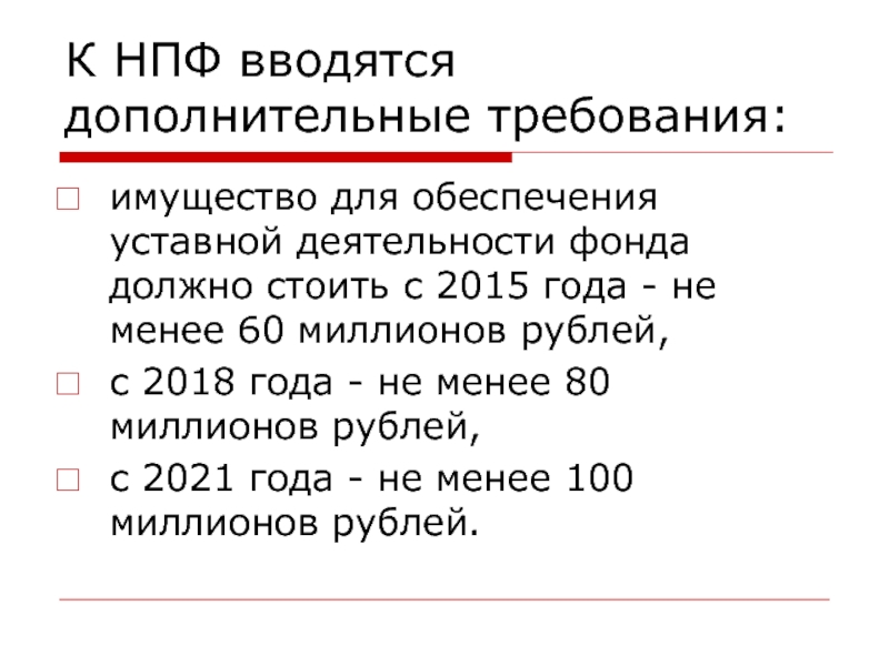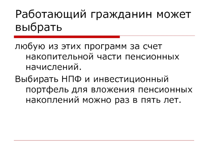 течение определенного срока до выхода на пенсию перечислять, например, в НПФ ежемесячно фиксированную сумму и будет вправе рассчитывать после выхода на пенсию в течение минимум десяти лет с возможностью получать дополнительный фиксированный доход от НПФ. Это программа с гарантированной доходностью.