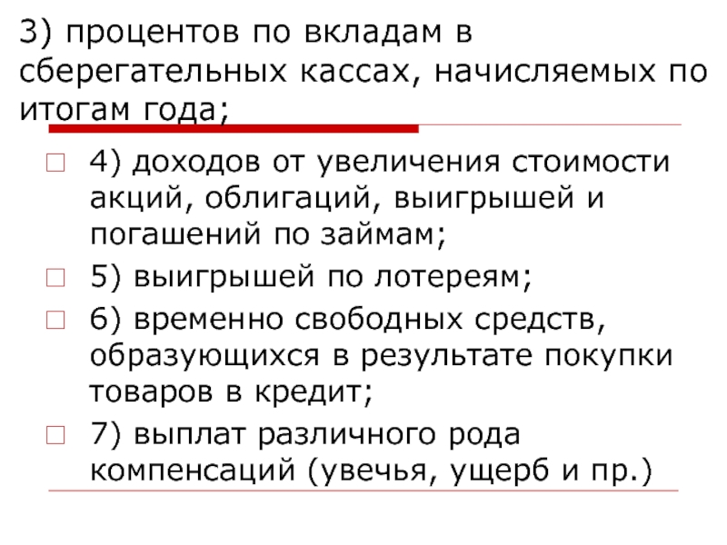Слайд 163) процентов по вкладам в сберегательных кассах, начисляемых по итогам года;