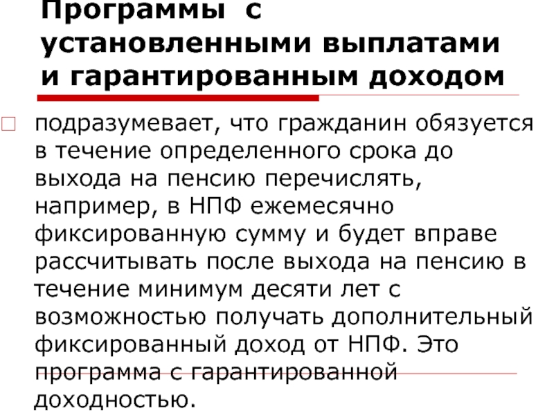 Слайд 28Программы с установленными выплатами и гарантированным доходом