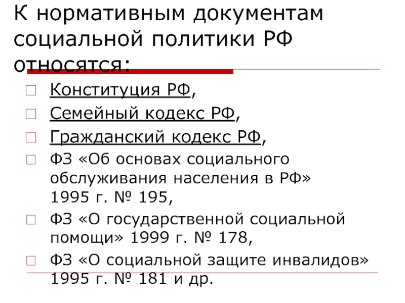 ФЗ «Об основах социального обслуживания населения в РФ» 1995 г. № 195,