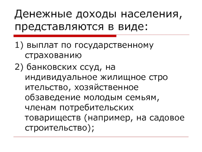 2) банковских ссуд, на индивидуальное жилищное строительство, хозяйственное обзаведение молодым семьям, членам потребительских товариществ (например, на садовое строительство);