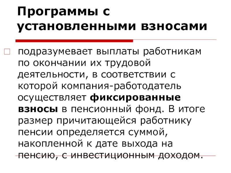 деятельности, в соответствии с которой компания-работодатель осуществляет фиксированные взносы в пенсионный фонд. В итоге размер причитающейся работнику пенсии определяется суммой, накопленной к дате выхода на пенсию, с инвестиционным доходом.