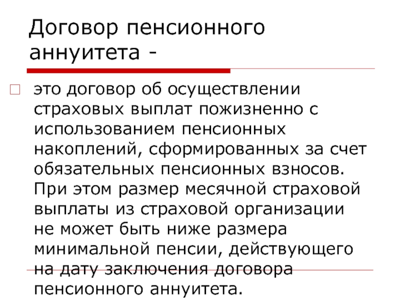 с использованием пенсионных накоплений, сформированных за счет обязательных пенсионных взносов. При этом размер месячной страховой выплаты из страховой организации не может быть ниже размера минимальной пенсии, действующего на дату заключения договора пенсионного аннуитета.