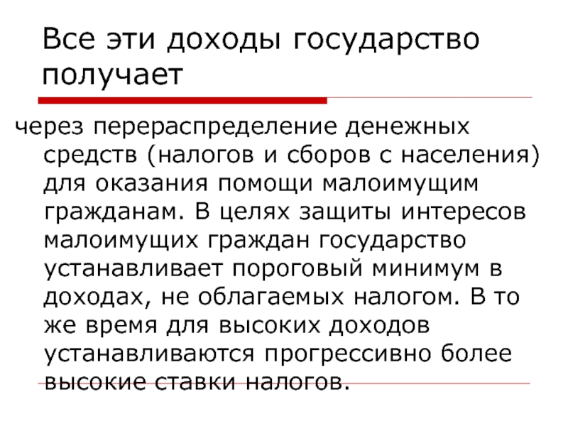 с населения) для оказания помощи малоимущим гражданам. В целях защиты интересов малоимущих граждан государство устанавливает пороговый минимум в доходах, не облагаемых налогом. В то же время для высоких доходов устанавливаются прогрессивно более высокие ставки налогов.