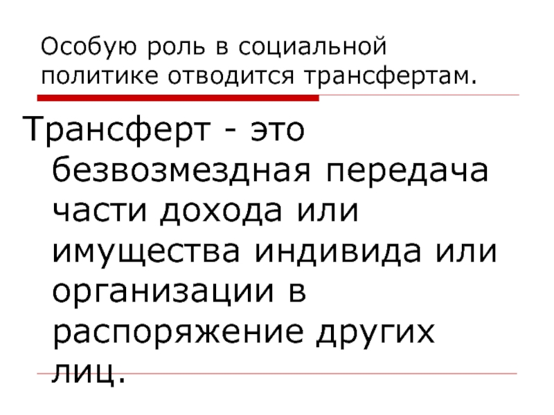 Слайд 18Особую роль в социальной политике отводится трансфертам.