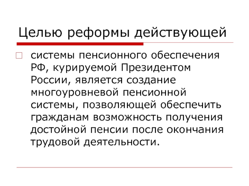 создание многоуровневой пенсионной системы, позволяющей обеспечить гражданам возможность получения достойной пенсии после окончания трудовой деятельности.