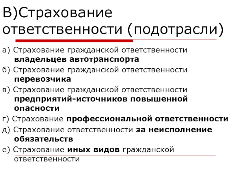 В)Страхование ответственности(объект страхования – ответственность перед третьими лицами, которым может быть причинен ущерб)