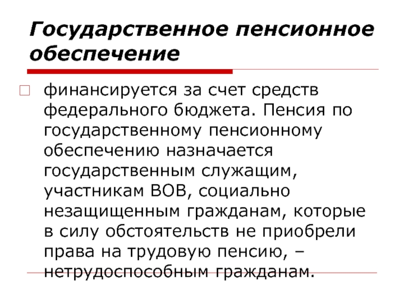 пенсионному обеспечению назначается государственным служащим, участникам ВОВ, социально незащищенным гражданам, которые в силу обстоятельств не приобрели права на трудовую пенсию, – нетрудоспособным гражданам.