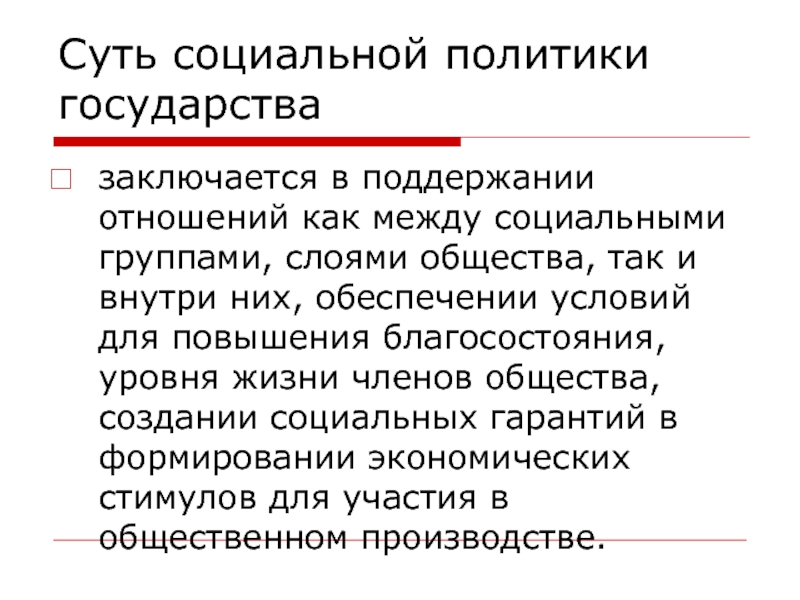 слоями общества, так и внутри них, обеспечении условий для повышения благосостояния, уровня жизни членов общества, создании социальных гарантий в формировании экономических стимулов для участия в общественном производстве.