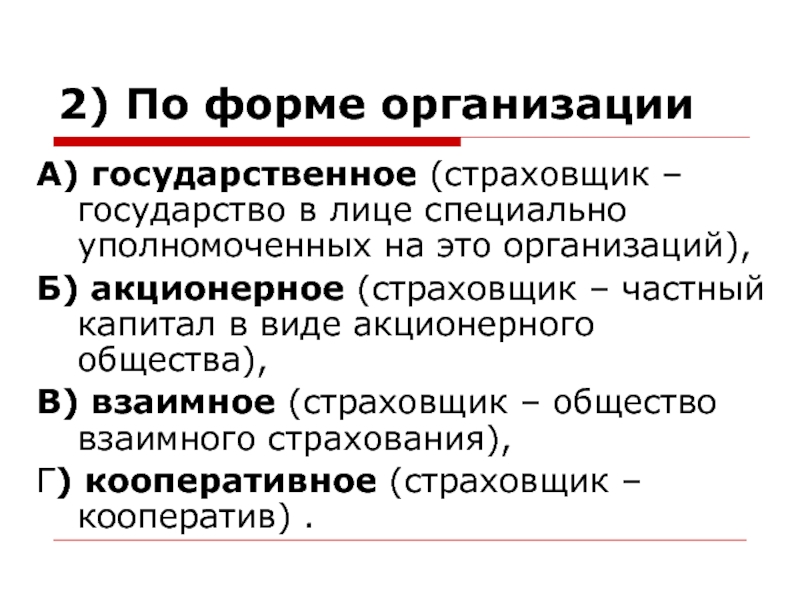 Б) акционерное (страховщик – частный капитал в виде акционерного общества),