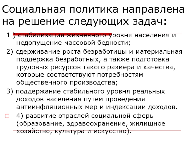 Слайд 6Социальная политика направлена на решение следующих задач: