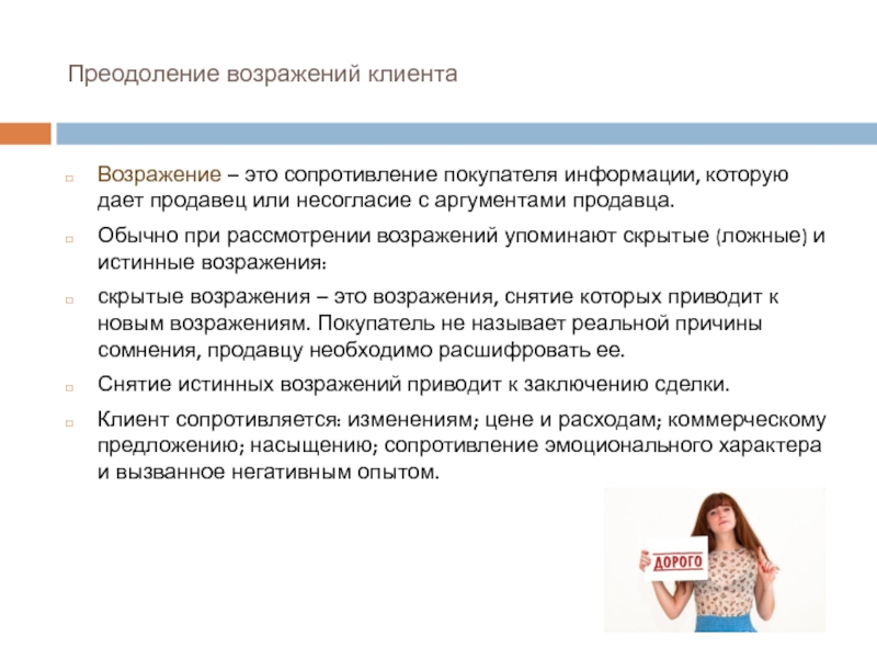 Возражение – это сопротивление покупателя информации, которую дает продавец