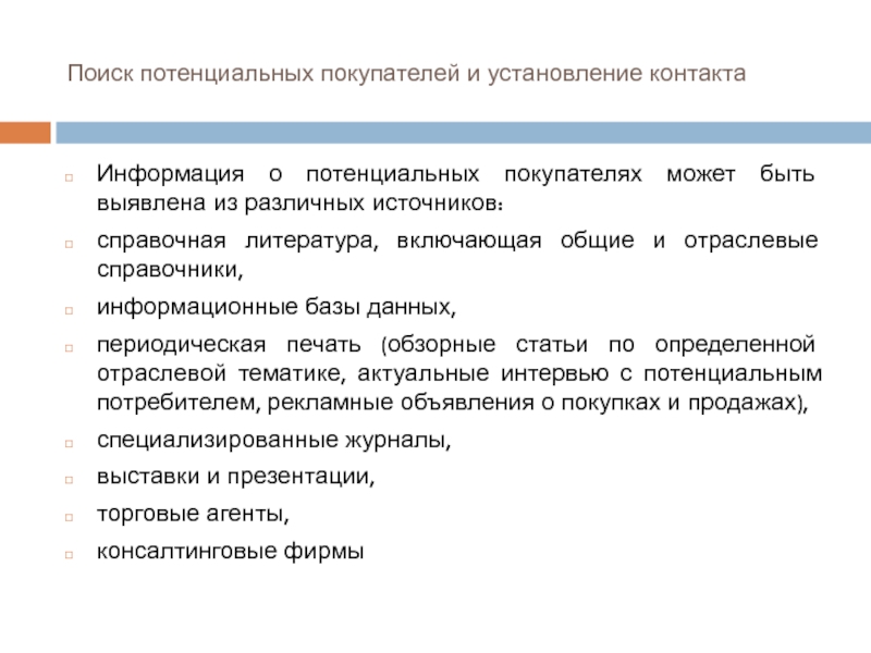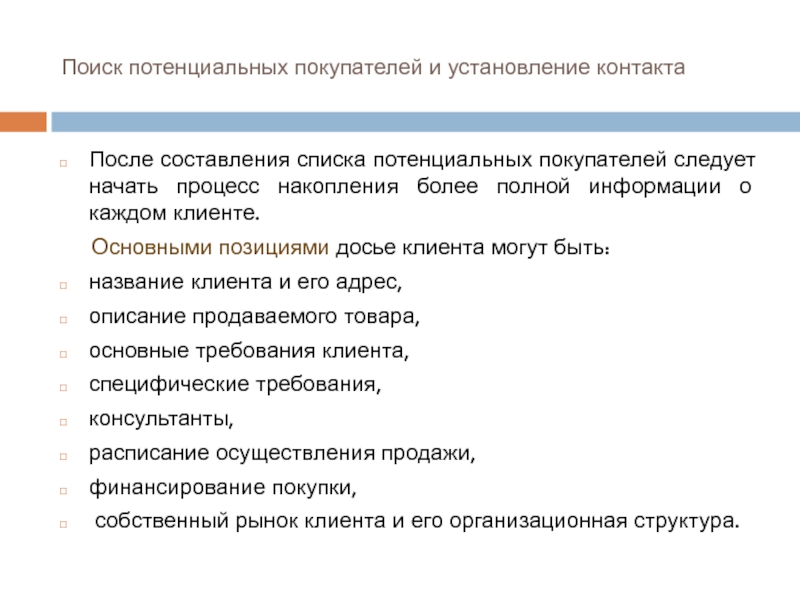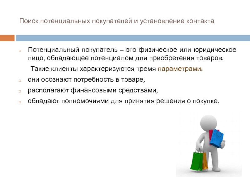 Слайд 10Поиск потенциальных покупателей и установление контакта