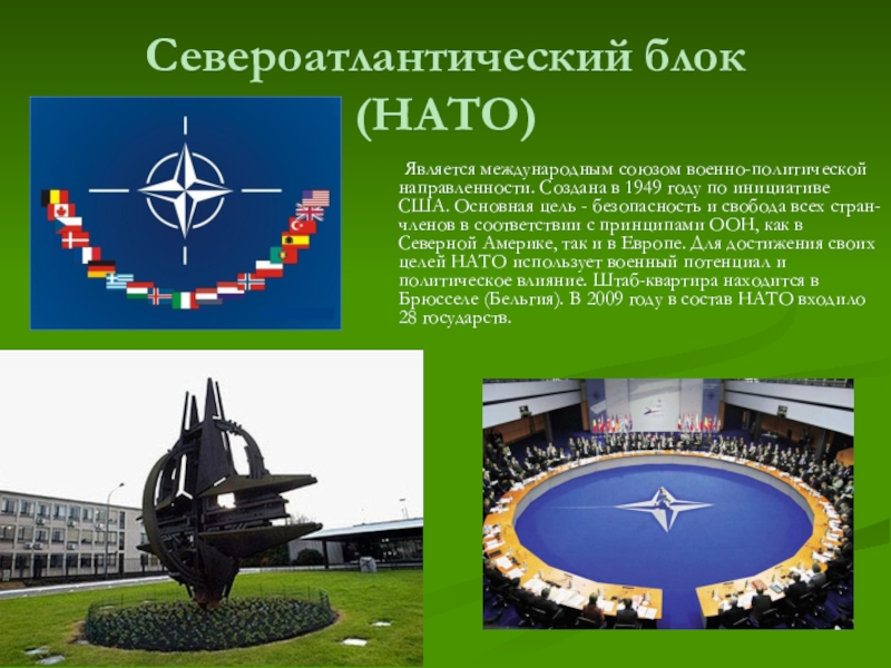 Создана в 1949 году по инициативе США. Основная цель - безопасность и свобода всех стран-членов в соответствии с принципами ООН, как в Северной Америке, так и в Европе. Для достижения своих целей НАТО использует военный потенциал и политическое влияние. Штаб-квартира находится в Брюсселе (Бельгия). В 2009 году в состав НАТО входило 28 государств.