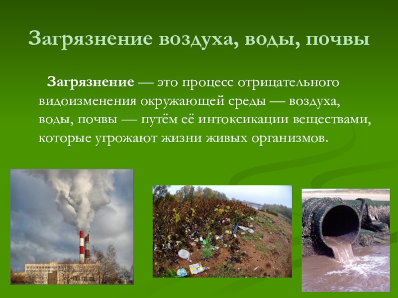 окружающей среды — воздуха, воды, почвы — путём её интоксикации веществами, которые угрожают жизни живых организмов.