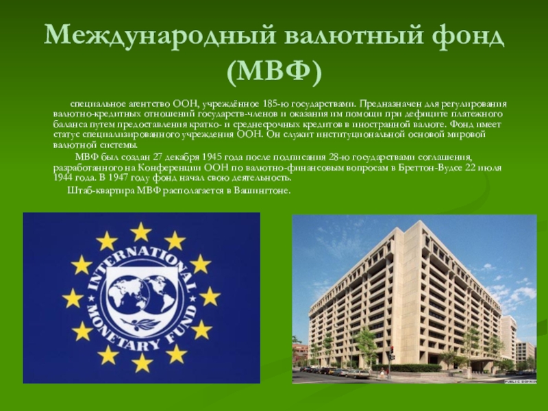 агентство ООН, учреждённое 185-ю государствами. Предназначен для регулирования валютно-кредитных отношений государств-членов и оказания им помощи при дефиците платежного баланса путем предоставления кратко- и среднесрочных кредитов в иностранной валюте. Фонд имеет статус специализированного учреждения ООН. Он служит институциональной основой мировой валютной системы.
