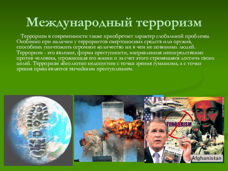 характер глобальной проблемы. Особенно при наличии у террористов смертоносных средств или оружия, способных уничтожить огромное количество ни в чем не повинных людей. Терроризм - это явление, форма преступности, направленная непосредственно против человека, угрожающая его жизни и за счет этого стремящаяся достичь своих целей. Терроризм абсолютно недопустим с точки зрения гуманизма, а с точки зрения права является тягчайшим преступлением.