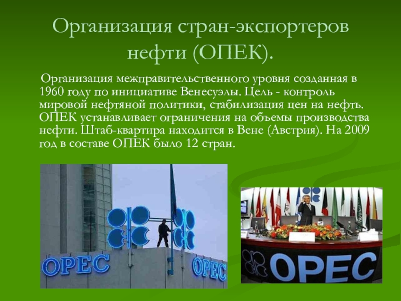 году по инициативе Венесуэлы. Цель - контроль мировой нефтяной политики, стабилизация цен на нефть. ОПЕК устанавливает ограничения на объемы производства нефти. Штаб-квартира находится в Вене (Австрия). На 2009 год в составе ОПЕК было 12 стран.