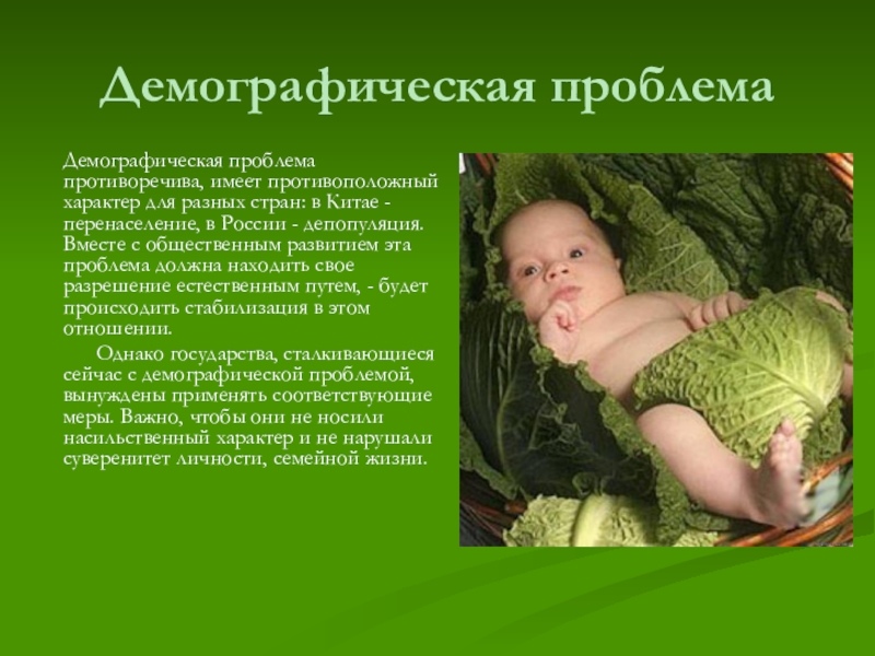Однако государства, сталкивающиеся сейчас с демографической проблемой, вынуждены применять соответствующие меры. Важно, чтобы они не носили насильственный характер и не нарушали суверенитет личности, семейной жизни.