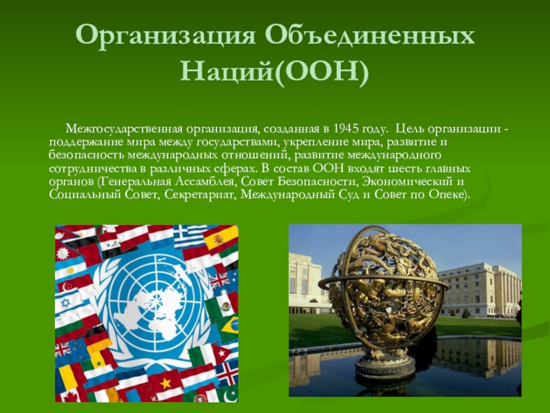 в 1945 году. Цель организации - поддержание мира между государствами, укрепление мира, развитие и безопасность международных отношений, развитие международного сотрудничества в различных сферах. В состав ООН входят шесть главных органов (Генеральная Ассамблея, Совет Безопасности, Экономический и Социальный Совет, Секретариат, Международный Суд и Совет по Опеке).