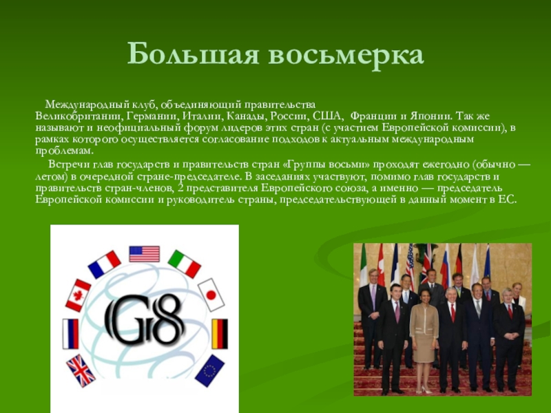 Международный клуб, объединяющий правительства Великобритании, Германии, Италии, Канады, России, США,
