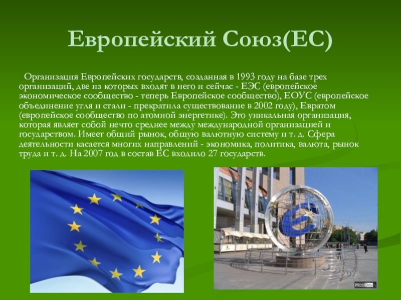 году на базе трех организаций, две из которых входят в него и сейчас - ЕЭС (европейское экономическое сообщество - теперь Европейское сообщество), ЕОУС (европейское объединение угля и стали - прекратила существование в 2002 году), Евратом (европейское сообщество по атомной энергетике). Это уникальная организация, которая являет собой нечто среднее между международной организацией и государством. Имеет общий рынок, общую валютную систему и т. д. Сфера деятельности касается многих направлений - экономика, политика, валюта, рынок труда и т. д. На 2007 год в состав ЕС входило 27 государств.