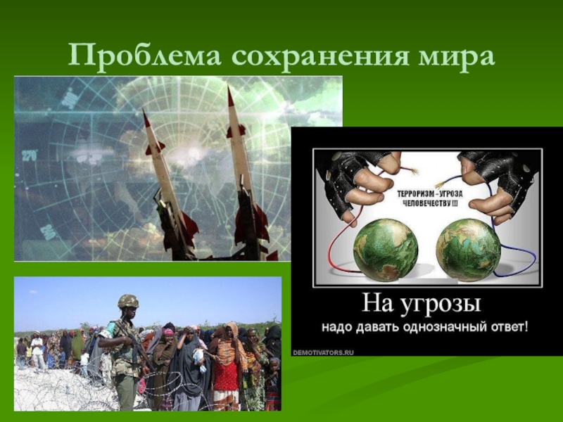 проблем, от решения которых зависит социальный прогресс человечества и сохранение цивилизации. Эти проблемы характеризуются динамизмом, возникают как объективный фактор развития общества и для своего решения требуют объединённых усилий всего человечества. Глобальные проблемы взаимосвязаны, охватывают все стороны жизни людей и касаются всех стран мира.