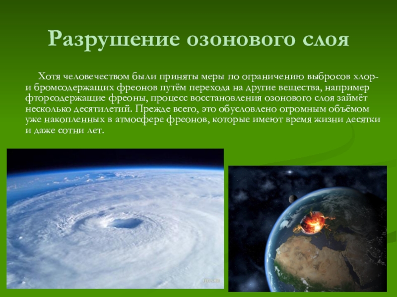 меры по ограничению выбросов хлор- и бромсодержащих фреонов путём перехода на другие вещества, например фторсодержащие фреоны, процесс восстановления озонового слоя займёт несколько десятилетий. Прежде всего, это обусловлено огромным объёмом уже накопленных в атмосфере фреонов, которые имеют время жизни десятки и даже сотни лет.