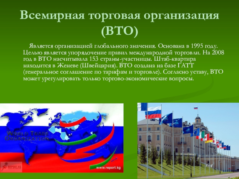 Основана в 1995 году. Целью является упорядочение правил международной торговли. На 2008 год в ВТО насчитывала 153 страны-участницы. Штаб-квартира находится в Женеве (Швейцария). ВТО создана на базе ГАТТ (генеральное соглашение по тарифам и торговле). Согласно уставу, ВТО может урегулировать только торгово-экономические вопросы.