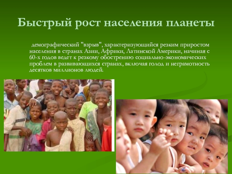 характеризующийся резким приростом населения в странах Азии, Африки, Латинской Америки, начиная с 60-х годов ведет к резкому обострению социально-экономических проблем в развивающихся странах, включая голод и неграмотность десятков миллионов людей.