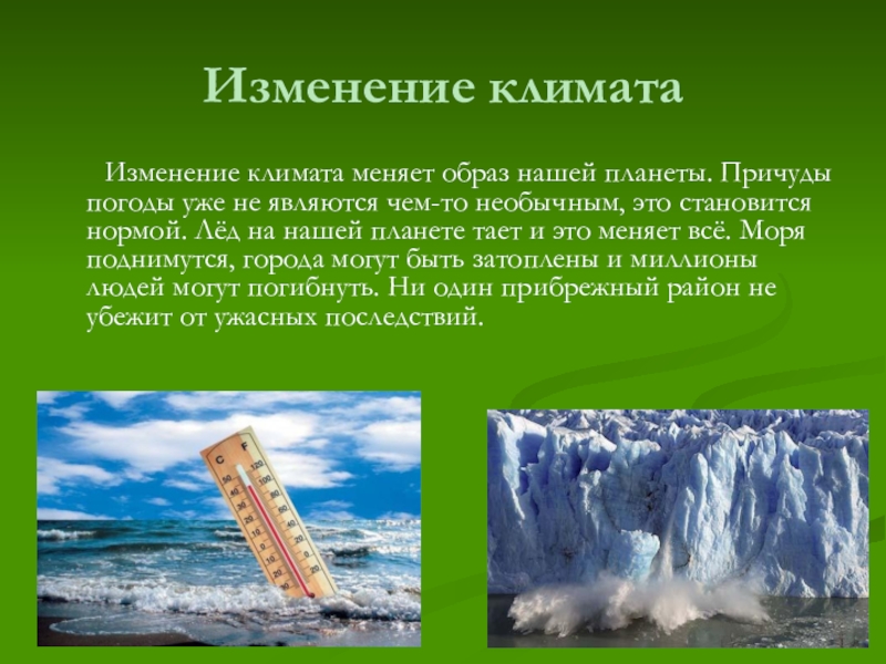 Причуды погоды уже не являются чем-то необычным, это становится нормой. Лёд на нашей планете тает и это меняет всё. Моря поднимутся, города могут быть затоплены и миллионы людей могут погибнуть. Ни один прибрежный район не убежит от ужасных последствий.