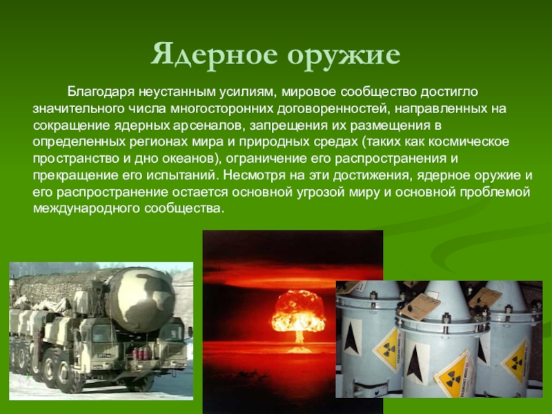 сообщество достигло значительного числа многосторонних договоренностей, направленных на сокращение ядерных арсеналов, запрещения их размещения в определенных регионах мира и природных средах (таких как космическое пространство и дно океанов), ограничение его распространения и прекращение его испытаний. Несмотря на эти достижения, ядерное оружие и его распространение остается основной угрозой миру и основной проблемой международного сообщества.