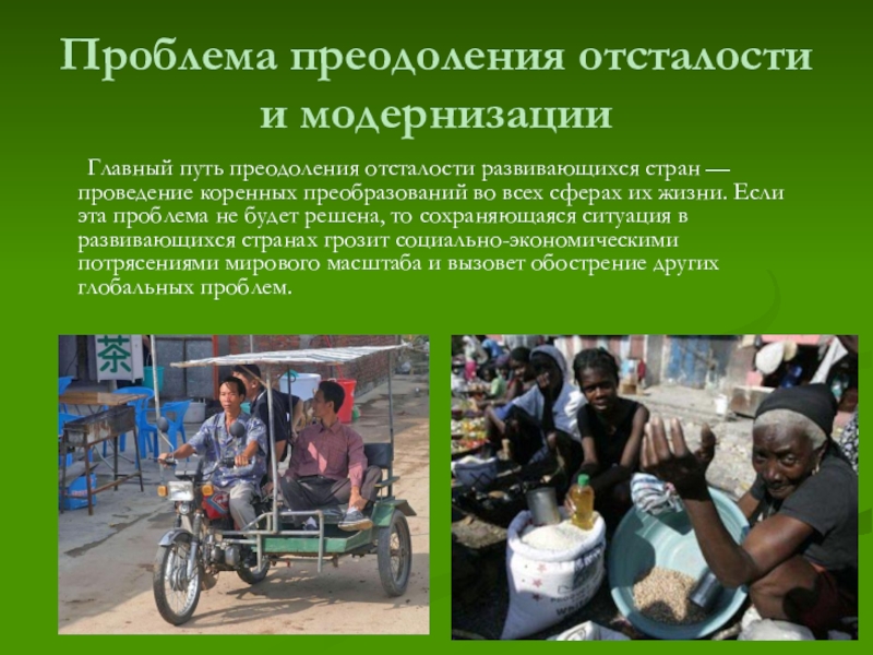 отсталости развивающихся стран — проведение коренных преобразований во всех сферах их жизни. Если эта проблема не будет решена, то сохраняющаяся ситуация в развивающихся странах грозит социально-экономическими потрясениями мирового масштаба и вызовет обострение других глобальных проблем.
