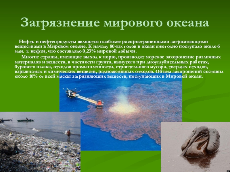 наиболее распространенными загрязняющими веществами в Мировом океане. К началу 80-ых годов в океан ежегодно поступало около 6 млн. т. нефти, что составляло 0,23% мировой добычи.