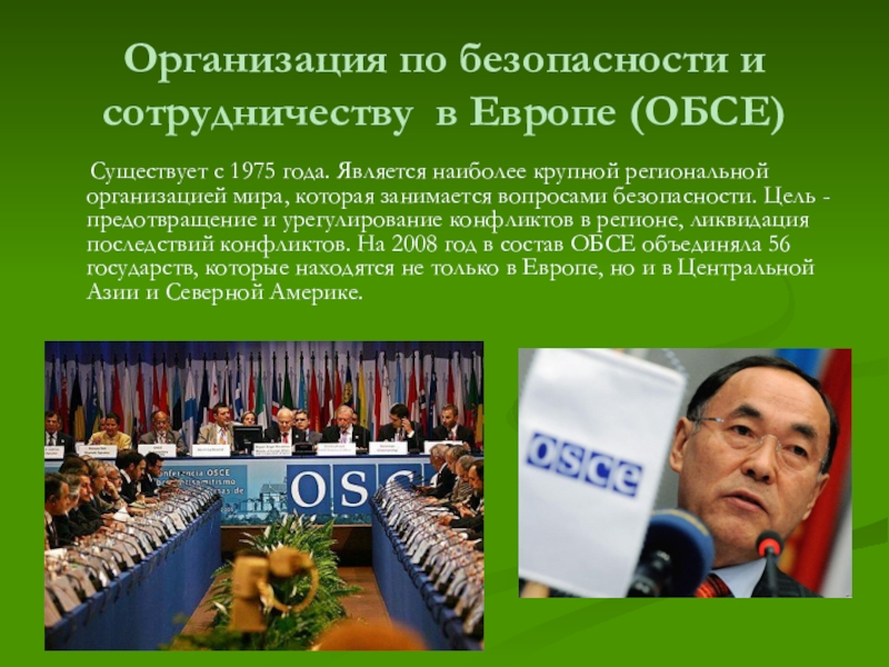 с 1975 года. Является наиболее крупной региональной организацией мира, которая занимается вопросами безопасности. Цель - предотвращение и урегулирование конфликтов в регионе, ликвидация последствий конфликтов. На 2008 год в состав ОБСЕ объединяла 56 государств, которые находятся не только в Европе, но и в Центральной Азии и Северной Америке.