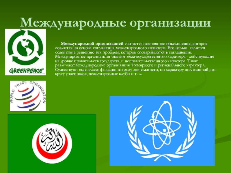 объединение, которое создается на основе соглашения международного характера. Его целью является содействие решению тех проблем, которые оговариваются в соглашении. Международные организации бывают межгосударственного характера - действующие на уровне правительств государств, и неправительственного характера. Также различают международные организации всемирного и регионального характера. Существуют еще классификации по роду деятельности, по характеру полномочий, по кругу участников, международные клубы и т. д.