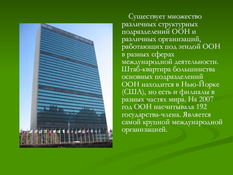 различных организаций, работающих под эгидой ООН в разных сферах международной деятельности. Штаб-квартира большинства основных подразделений ООН находится в Нью-Йорке (США), но есть и филиалы в разных частях мира. На 2007 год ООН насчитывала 192 государства-члена. Является самой крупной международной организацией.