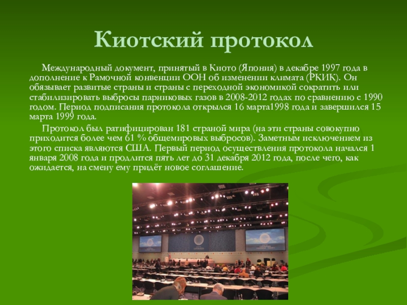 в декабре 1997 года в дополнение к Рамочной конвенции ООН об изменении климата (РКИК). Он обязывает развитые страны и страны с переходной экономикой сократить или стабилизировать выбросы парниковых газов в 2008-2012 годах по сравнению с 1990 годом. Период подписания протокола открылся 16 марта1998 года и завершился 15 марта 1999 года.