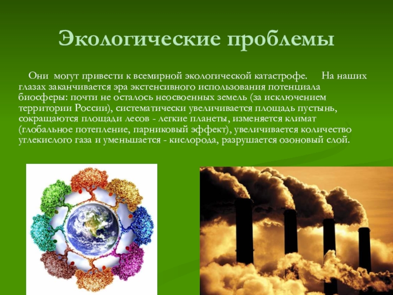 экологической катастрофе. На наших глазах заканчивается эра экстенсивного использования потенциала биосферы: почти не осталось неосвоенных земель (за исключением территории России), систематически увеличивается площадь пустынь, сокращаются площади лесов - легкие планеты, изменяется климат (глобальное потепление, парниковый эффект), увеличивается количество углекислого газа и уменьшается - кислорода, разрушается озоновый слой.