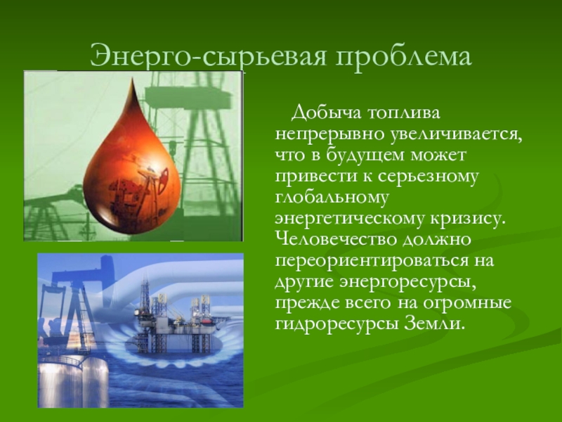 в будущем может привести к серьезному глобальному энергетическому кризису. Человечество должно переориентироваться на другие энергоресурсы, прежде всего на огромные гидроресурсы Земли.