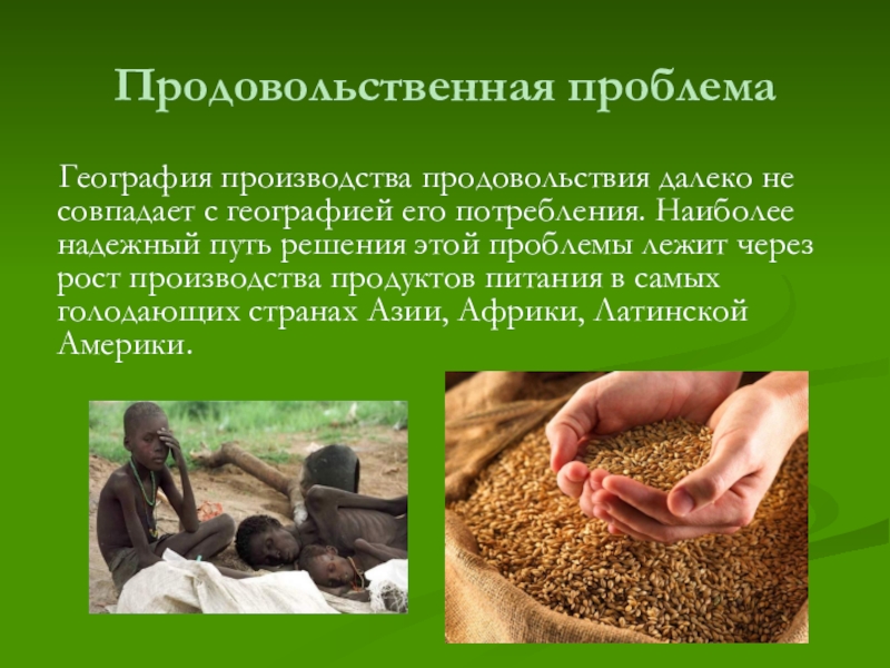 потребления. Наиболее надежный путь решения этой проблемы лежит через рост производства продуктов питания в самых голодающих странах Азии, Африки, Латинской Америки.