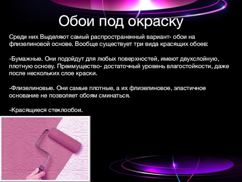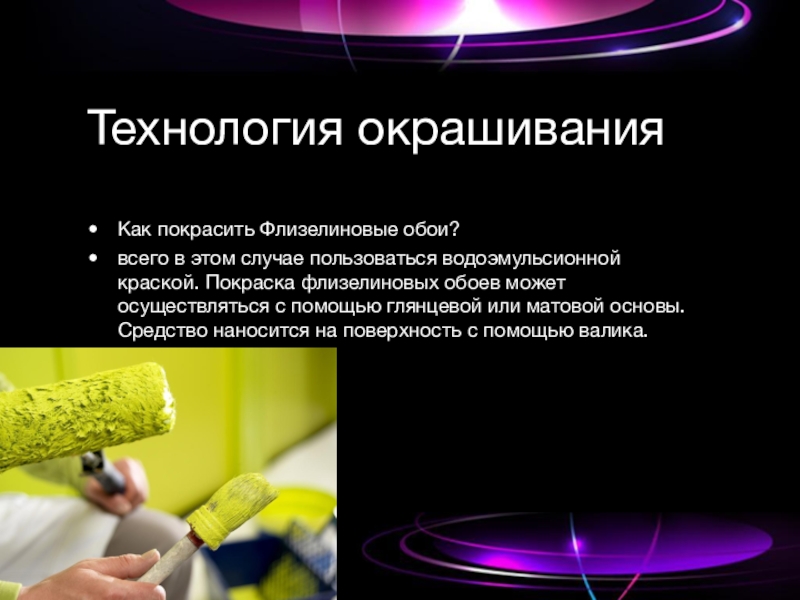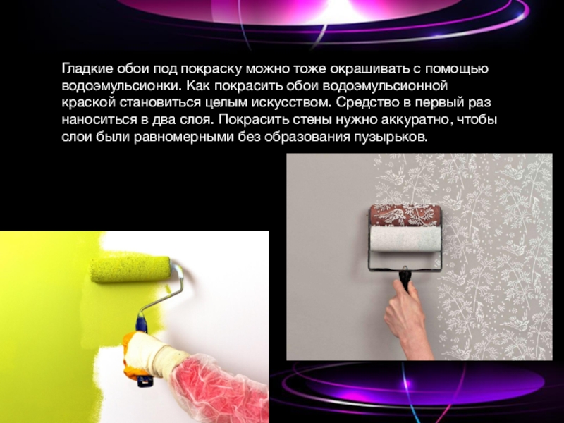 Слайд 21Гладкие обои под покраску можно тоже окрашивать с помощью водоэмульсионки. Как
