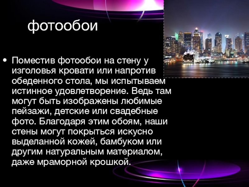 мы испытываем истинное удовлетворение. Ведь там могут быть изображены любимые пейзажи, детские или свадебные фото. Благодаря этим обоям, наши стены могут покрыться искусно выделанной кожей, бамбуком или другим натуральным материалом, даже мраморной крошкой.