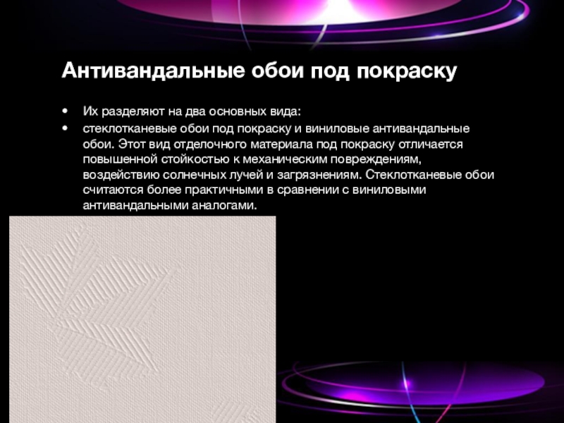 под покраску и виниловые антивандальные обои. Этот вид отделочного материала под покраску отличается повышенной стойкостью к механическим повреждениям, воздействию солнечных лучей и загрязнениям. Стеклотканевые обои считаются более практичными в сравнении с виниловыми антивандальными аналогами.