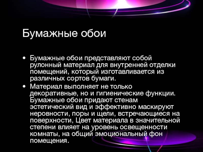 Материал выполняет не только декоративные, но и гигиенические функции. Бумажные обои придают стенам эстетический вид и эффективно маскируют неровности, поры и щели, встречающиеся на поверхности, Цвет материала в значительной степени влияет на уровень освещенности комнаты, на общий эмоциональный фон помещения.