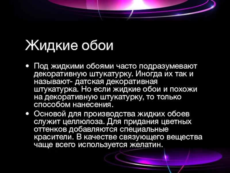 Основой для производства жидких обоев служит целлюлоза. Для придания цветных оттенков добавляются специальные красители. В качестве связующего вещества чаще всего используется желатин.