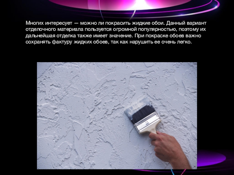Слайд 22Многих интересует — можно ли покрасить жидкие обои. Данный вариант отделочного