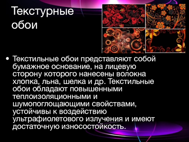 нанесены волокна хлопка, льна, шелка и др. Текстильные обои обладают повышенными теплоизоляционными и шумопоглощающими свойствами, устойчивы к воздействию ультрафиолетового излучения и имеют достаточную износостойкость.
